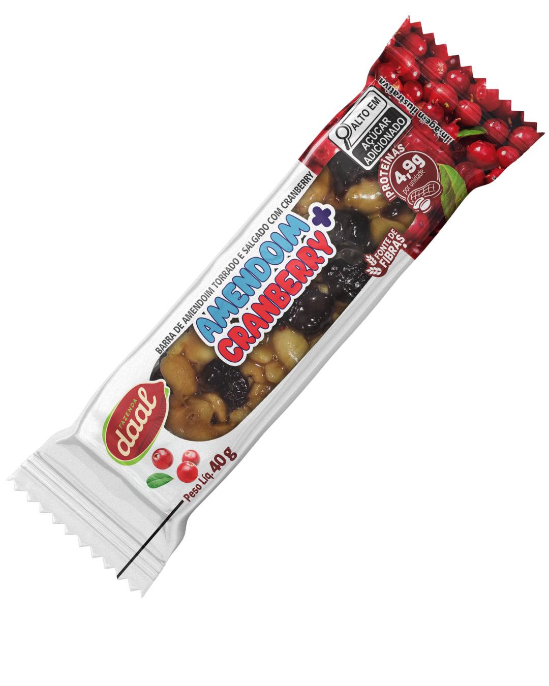 A Barra Amendoim Torrado Salgado Cranberry une o sabor marcante do amendoim Daal, com DNA exclusivo, ao toque levemente adocicado do cranberry. Com fonte de fibras, proteínas e energia na medida certa, é um snack prático para acompanhar a rotina, seja no meio da manhã, à tarde, antes ou depois das atividades, ou sempre que der vontade de comer algo saboroso e equilibrado. Ideal para quem busca conveniência sem abrir mão de uma experiência diferente a cada mordida.